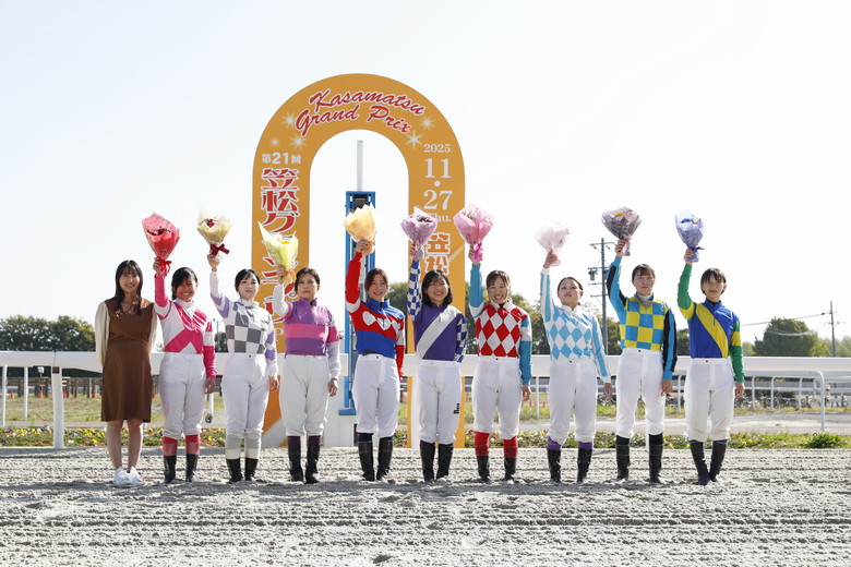 笠松ラウンドは、素晴らしい晴天の下行われた。第4レース終了後に行われた、出場騎手9名がゴール前に集う騎手紹介セレモニーでは、この日多く集まった来場客が思い思いの騎手に声援を送っていた。