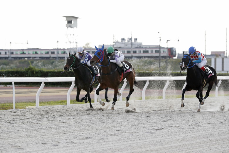 第10レースで行われた第1戦。スタートで「めっちゃ出た」という佐々木世麗騎手(兵庫)が早々に先手を取り、深澤杏花騎手(笠松)が番手と、前の情勢が決まりかかったところに、「終始かかってしまった」という塩津璃菜騎手(兵庫)が更に外から並ぶ。レース前半は、ペースも意識して三者三すくみの様相。