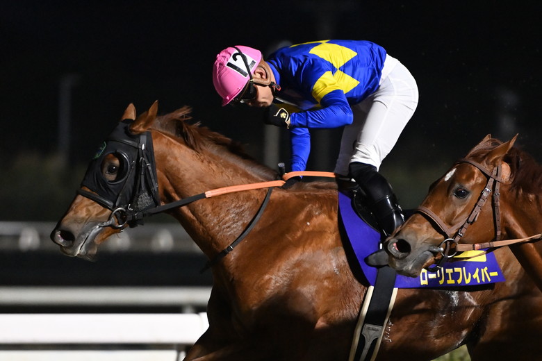 勝ったローリエフレイバーはこれで重賞4勝目。前走はマイルが合わず、3、2走前はダートグレードでいずれも2桁着順だったが、地方馬同士の得意距離で結果を残した。「ここのところ不甲斐ないレースが続いていましたが、今日は外枠なので決めたいと思っていました」と月岡健二調教師。7勝すべてが6~8枠なように、外めの枠が大得意な馬だ。母マヒナズヒルも管理した月岡調教師は母娘の特徴をこう話す。