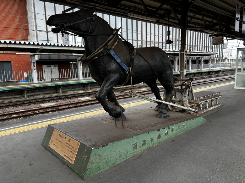 競馬場跡が“ほったらかし”になっているのはなんとも残念だが、JR岩見沢駅では今も競馬場があった頃の名残を見ることができる。3、4番線ホームにある“ばん馬の像”だ。競馬が行われていた頃から駅構内でひときわ目立っていたその像には、ソリを曳くばん馬の姿が見事に再現されていている。これほど迫力ある馬の像はなかなか見られない。末永くそこに残されるよう、祈るばかりだ。