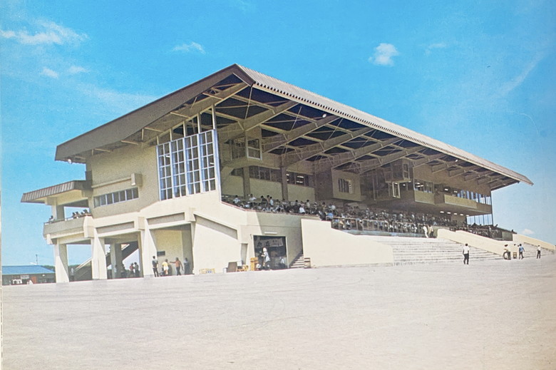 施設の西側には細長い建物と四角い建物が並んで建っている。一見すると競馬場のスタンドのように思えてしまうが、そこは以前、入場門とスタンドとの間だった部分。細長い建物のあたりにパドック、その東側にスタンドが建っていた。