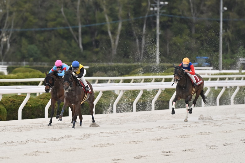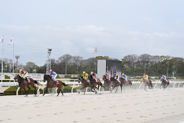 向正面からスタートを切ると、大方の予想通りオーケーバーディー(JRA)が先手を取った。逃げれば6戦4勝、2着1回と粘り腰を発揮できる馬。昨年12月のヤングジョッキーズシリーズ・ファイナルラウンド園田第3戦で逃げ切り勝ちを決めて以来の当地騎乗となる横山琉人騎手を背に、気分よくレースを運んだ。ところが、1~2コーナー付近で鼻出血を発症して急減速したのち、競走中止。