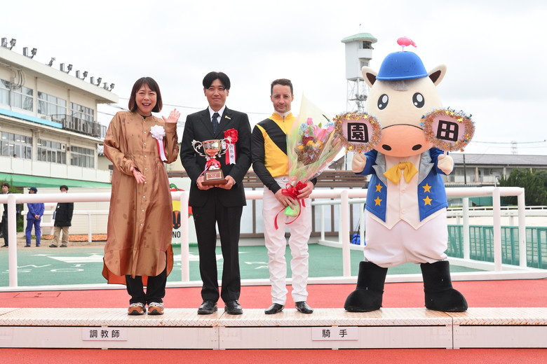 重賞初制覇の期待がかけられていた2着プロミストジーンは、どちらかというとトビがゆったりした馬。1周1051メートルのコンパクトなコースでコーナー6回の舞台だったが、「小回りも対応してくれました。2番手につけるのは予定通りで、やりたい競馬はできました」と武騎手。
