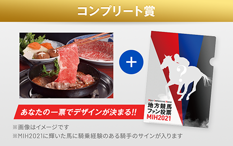 競馬ファンのみなさんにはぜひ今年心に残った2歳馬、3歳馬、古馬それぞれに投票してもらい、その中からさらに、最も印象に残った馬『MIH2021』を教えてください。投票された方には、『サイン入りオリジナルクリアファイル』や『高級和牛』など豪華賞品を抽選でプレゼントします。たくさんのご参加をお待ちしております。
