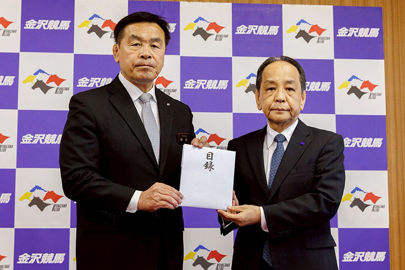 全国公営競馬主催者協議会ならびに地方競馬全国協会は9月30日(火)、8月7日の集中豪雨により浸水被害に見舞われた金沢競馬に対し、見舞金を贈呈しました。 馳浩石川県知事(写真左)に目録を渡すNAR斉藤理事長 関係者による記念撮影