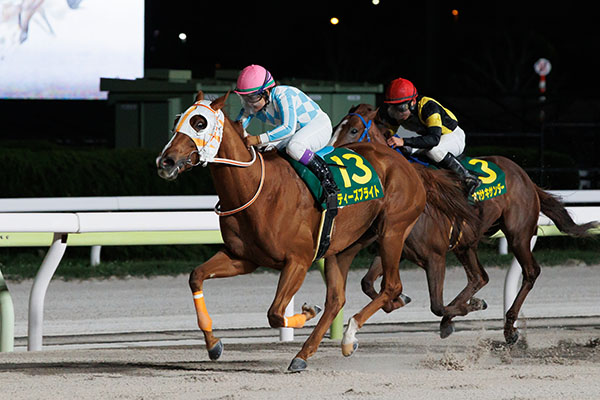ダート1,200mで行われた第1戦は、神尾香澄騎手(川崎)騎乗のティーズブライトが直線で外から抜け出して勝利。2着は上里直汰騎手(JRA)騎乗のオオサキサンダー、3着には谷内貫太騎手(大井)騎乗のエピルシェールが入りました。