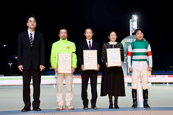 同シリーズでは優勝馬の馬主、調教師に対して協賛団体(社台スタリオンステーション、ジャパンブリーダーズカップ協会、日高軽種馬農業協同組合)より日本軽種馬協会を通じてボーナス賞金総額1,000万円が贈呈されます。式典では馬主の(有)キャロットファーム様、藤田輝信調教師、小黒英和厩務員に対して賞状、記念品、賞金の目録が授与されました。