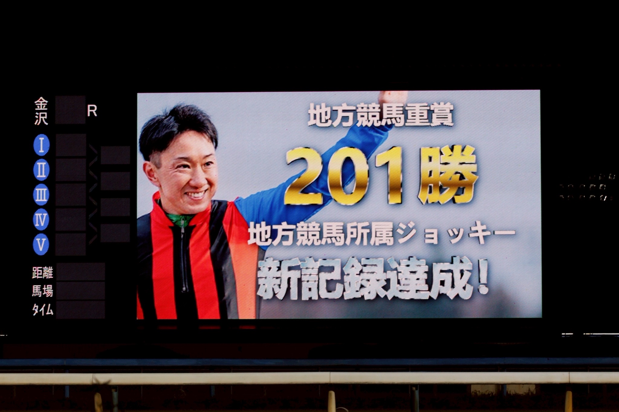 吉原寛人騎手(金沢 加藤和義厩舎)は、12月7日(日)第61回中日杯をクーアフュルストで優勝し、地方競馬重賞通算201勝を達成。安藤勝己元騎手(笠松)が記録した地方重賞通算200勝(※中央移籍後の地方重賞勝利も含めると231勝)の記録を更新し、地方競馬重賞最多勝記録を更新しました。
