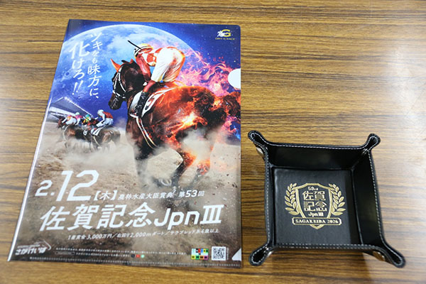 2月12日(木)佐賀競馬場で第53回佐賀記念が開催されます。同レースの開催を記念して「佐賀記念オリジナルレザーボタントレイ&クリアファイル」を抽選で 10名様にプレゼントいたします(提供:佐賀県競馬組合)。多数のご応募をお待ちしております。
